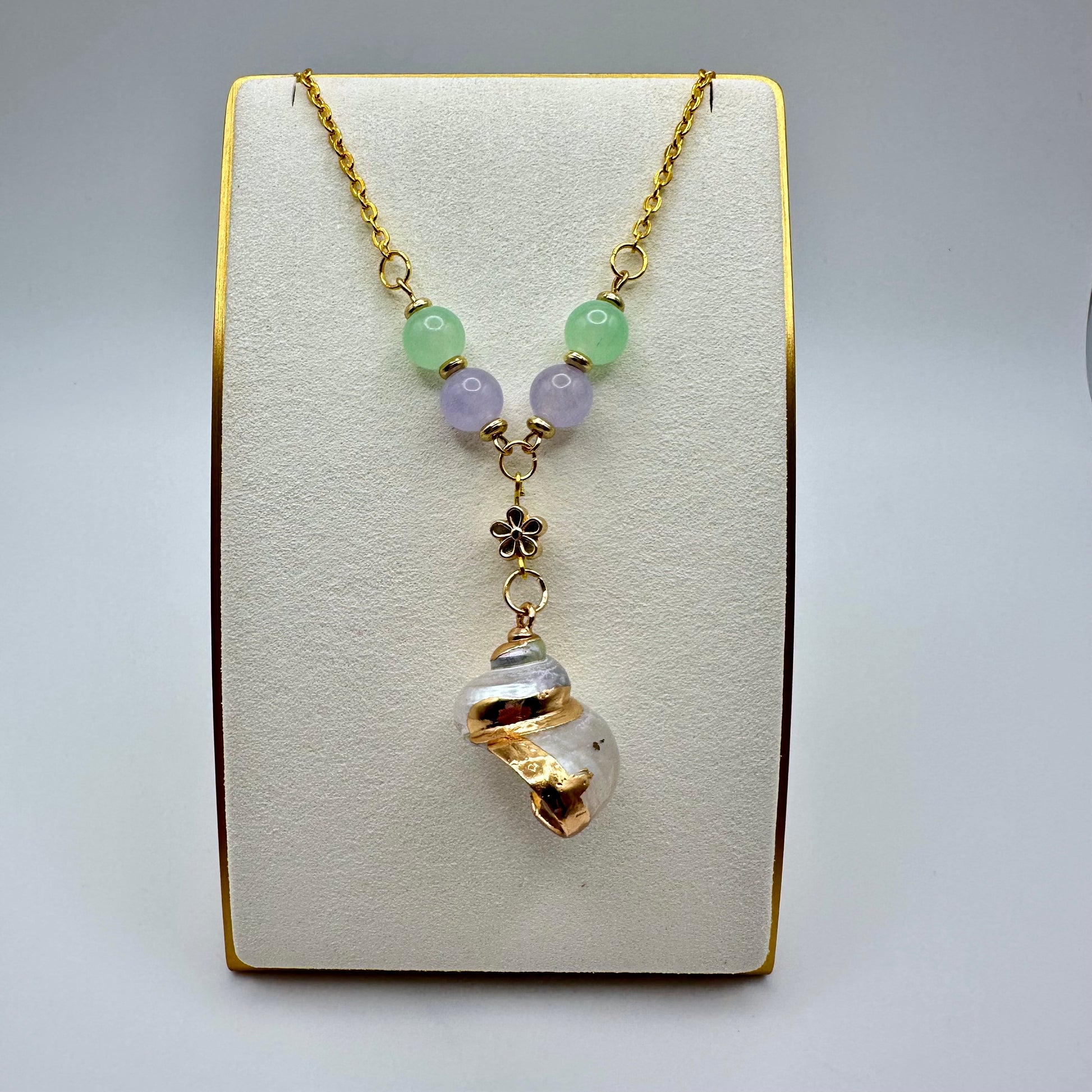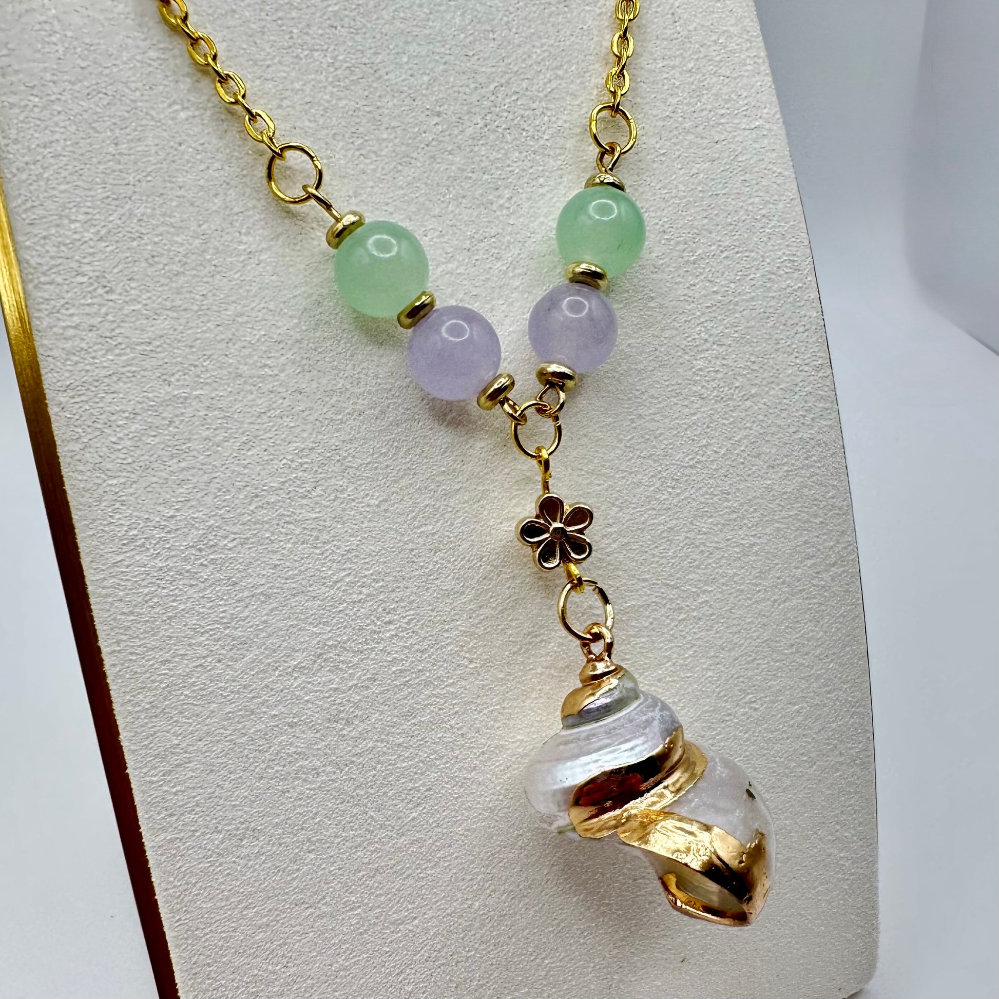 Soft as a sea breeze and sweet as a pastel daydream, the Mermaid Drift Necklace features calming seafoam and lavender-toned beads strung on a delicate gold chain. At the center is a faux spiral seashell pendant trimmed in gold, gently swaying with every step.