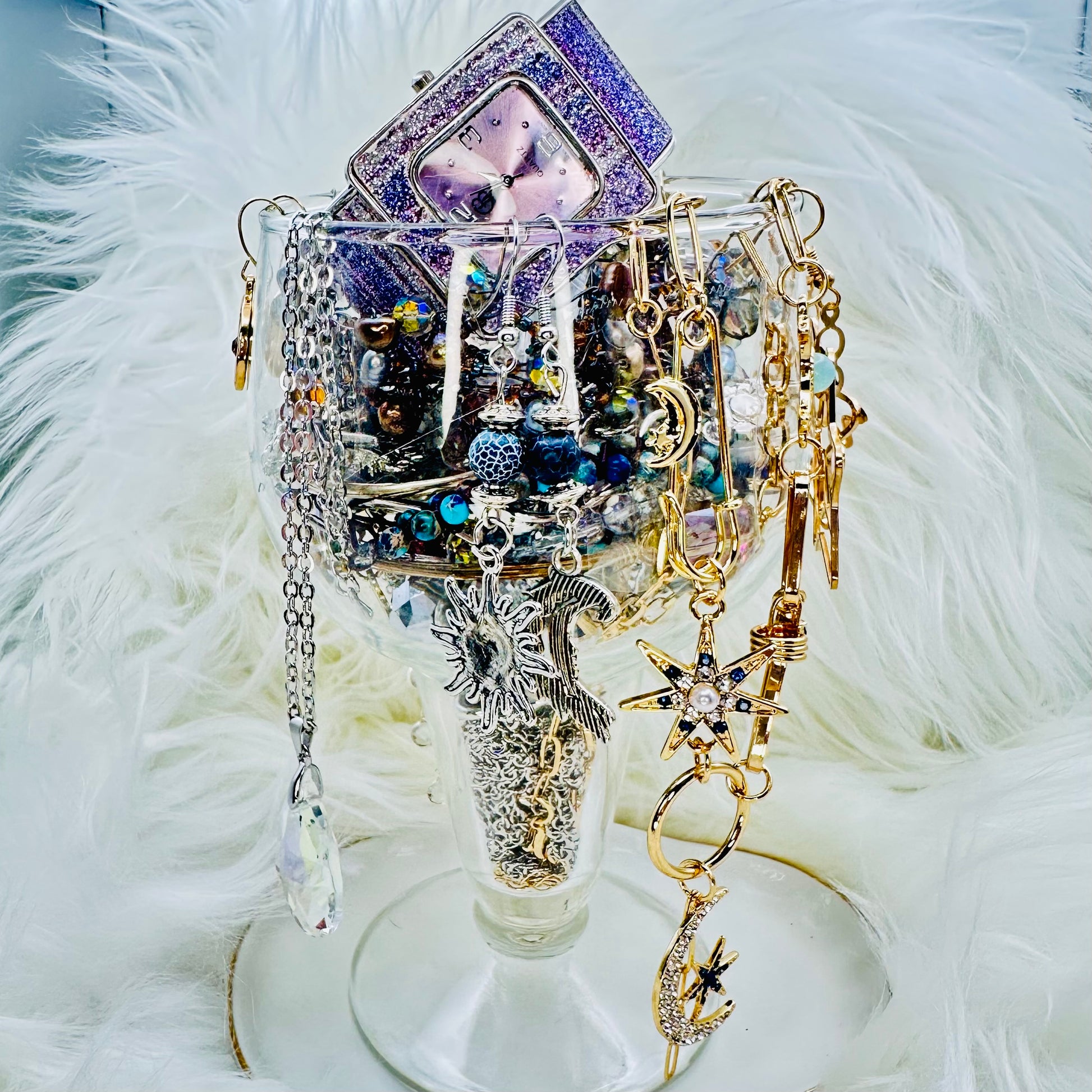 The Starlight Secrets Mystery Jewelry Jar is a celestial inspired theme, filled with dreamy night-sky shimmer, starry accents, and cosmic elegance.